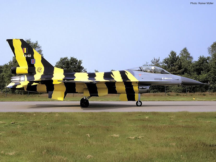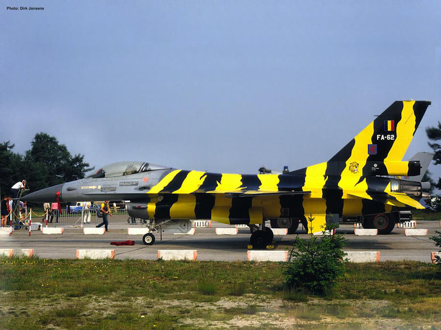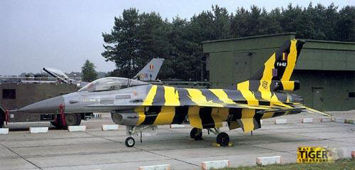 F-16’s are painted with a special paint that makes the aircraft less radar-reflective, therefore repainting an F-16 is a very expensive thing. However, the Tigers of Three-One would like to keep-up with tradition, by painting a tigerstriped aircraft for the 1985 Tigermeet. Finally an answer to solve this dilemma was brought to them by W. Lippens who is the paint manufacture for the Belgian Air Force. The solution consisted of painting a special plastic coating over the grey-paint. One’s the colours should be removed they just had to peel off the plastic layer, instead of completely repainting the aircraft. So be it… But then came flight-safety… and they judged that it would be to dangerous to fly the aircraft. This would take away the full spirit of the aircraft, and the project was almost cancelled, but then a compromise was made (mainly because the FA-62 was already prepared to be painted, standing in the paint shop with everything masked). The compromise was that nothing was to be painted in front of the air-intake… On friday the 21th the painters started to apply some 8 coats of the plastic primer. After the weekend, on monday 24th, the yellow base was sprayed. After this was completely dry, the tigerstripes could be painted. This was done by ‘Guy’ Truyens, J.P. Van Regenmortel and Danny Coremans. On Thursday that week, the aircraft was brought over to the Alpha Zone, home of Three-One squadron. There it was placed in a locked shelter, waiting to be used for the upcoming Tigermeet next week.